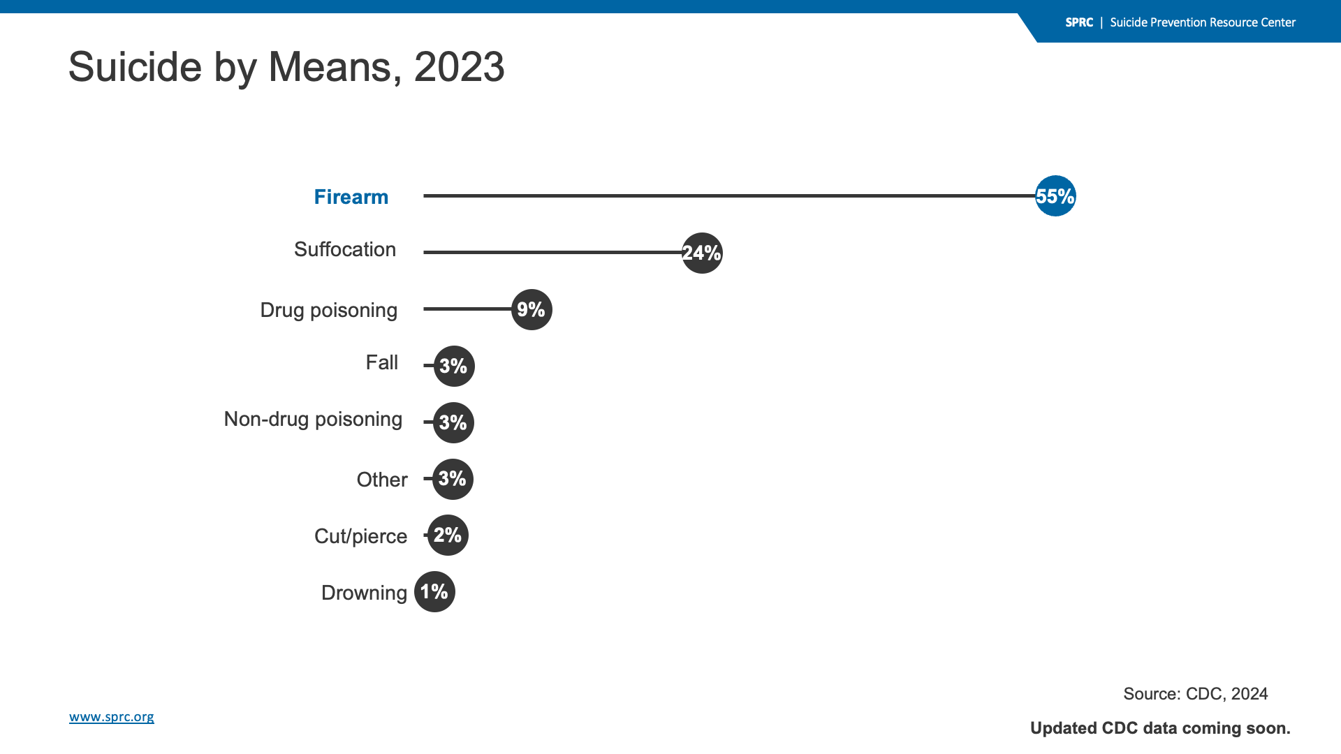 Firearms were the most common means of suicide in the United States in 2023, followed by suffocation and drug poisoning.