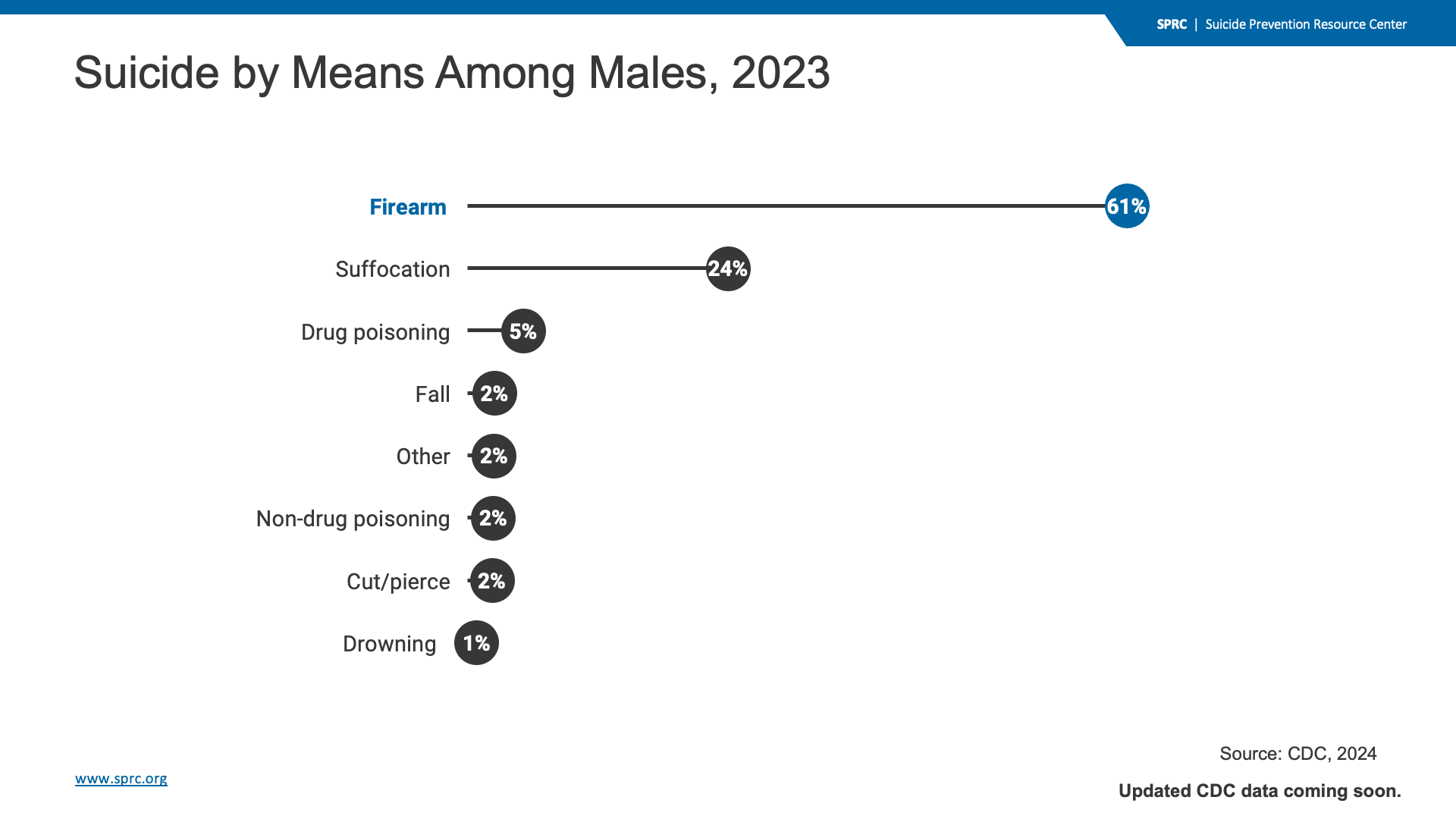 Firearms were used in over half of all suicides among males in 2023. Suffocation accounted for nearly a quarter (24 percent) of suicides among males.