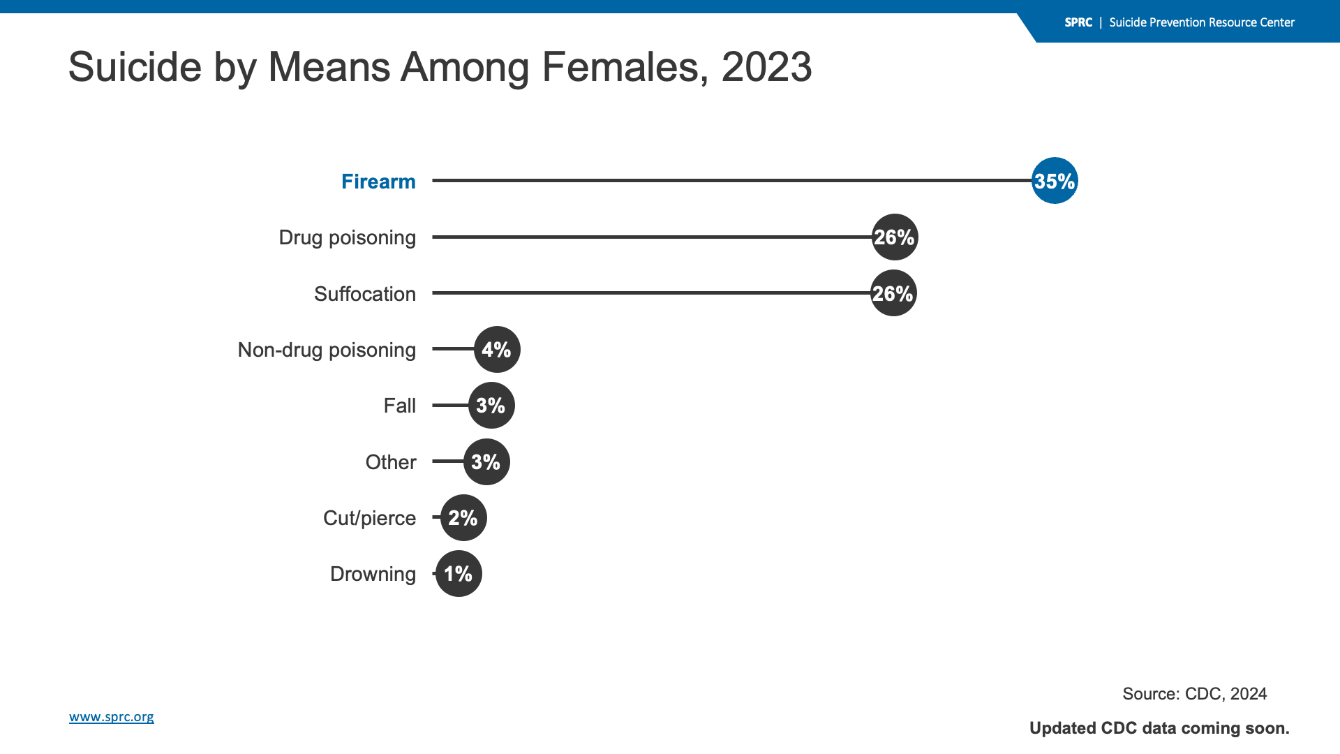 Among females, firearms were the most common means of suicide in 2023. Suicide by means of firearm, drug poisoning, and suffocation accounted for almost nine in ten suicides.