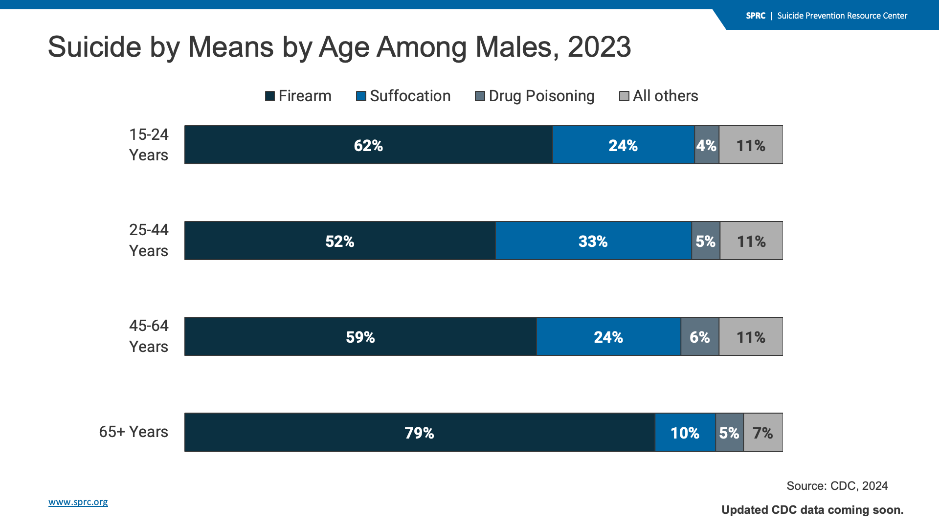 In 2023, firearms were the most common means of suicide for males of all age groups. Firearms were used in over three-quarters of suicide deaths among males over age 65. Suicide by means of firearm or suffocation accounted for over 8 in 10 suicide deaths among males in all age groups.