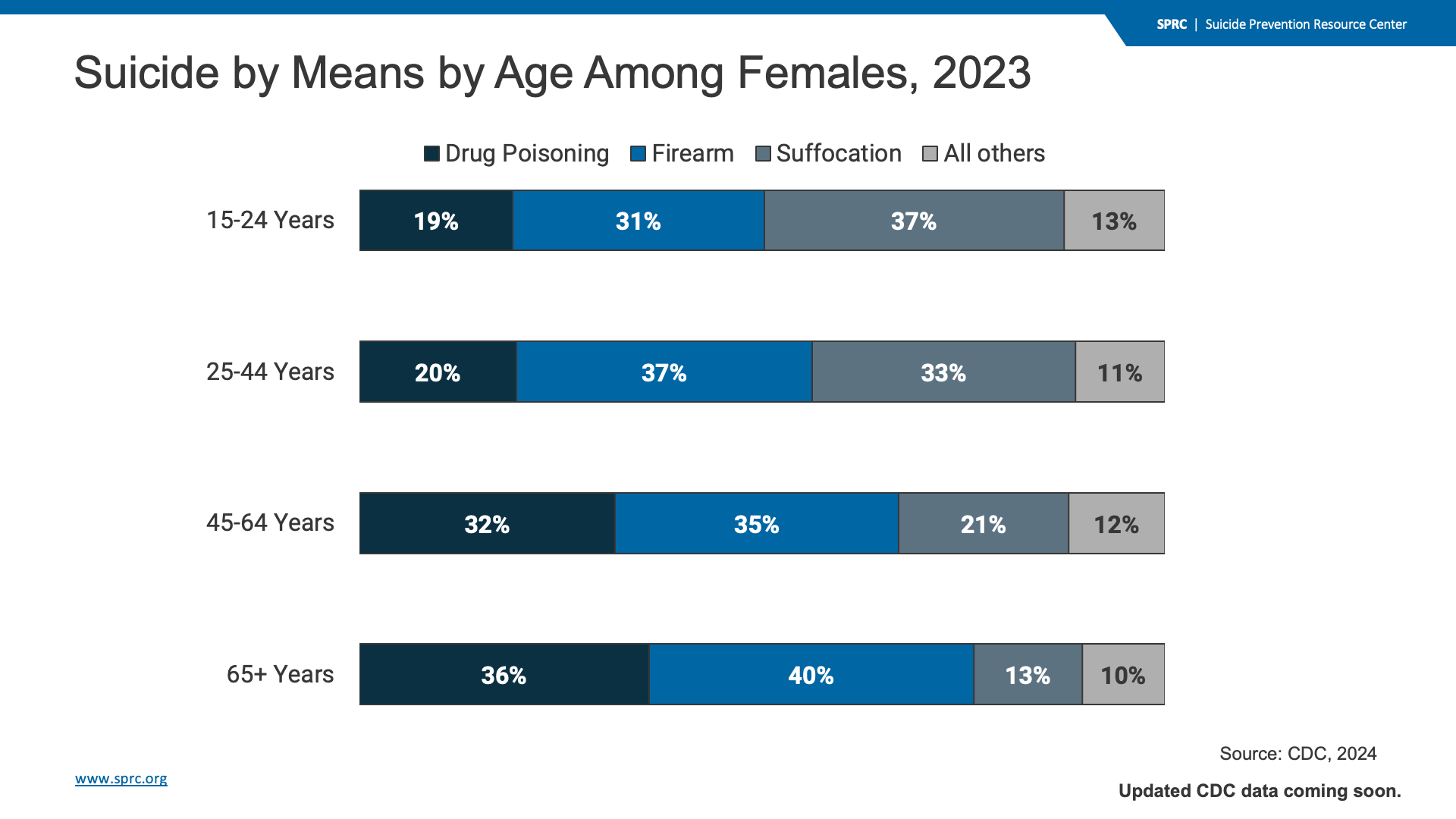 Females of different age groups used different means of suicide in 2023. Younger females were most likely to die by suffocation, while older females were more likely to die by means of firearm or drug poisoning.