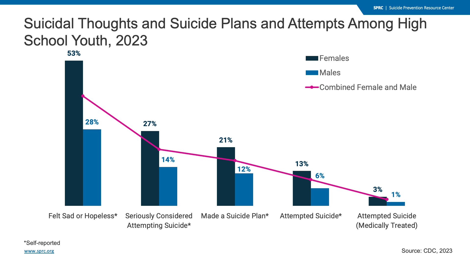 In 2021, the percentages of female high school youth who felt sad, seriously considered suicide, made a suicide plan, or attempted suicide were higher than the percentage of male high school youth and male and female high school youth combined. Rates of suicidal thoughts and suicide attempts were higher among high school youth than among adults in general.4