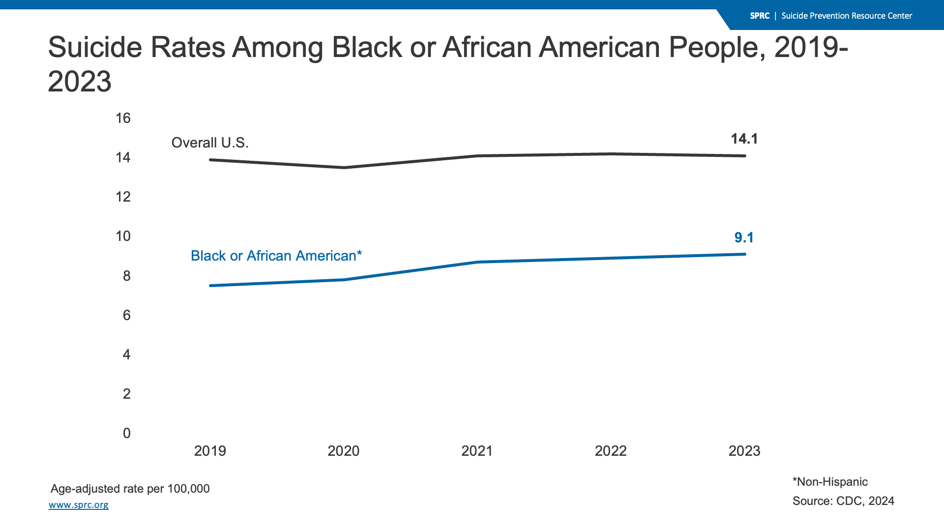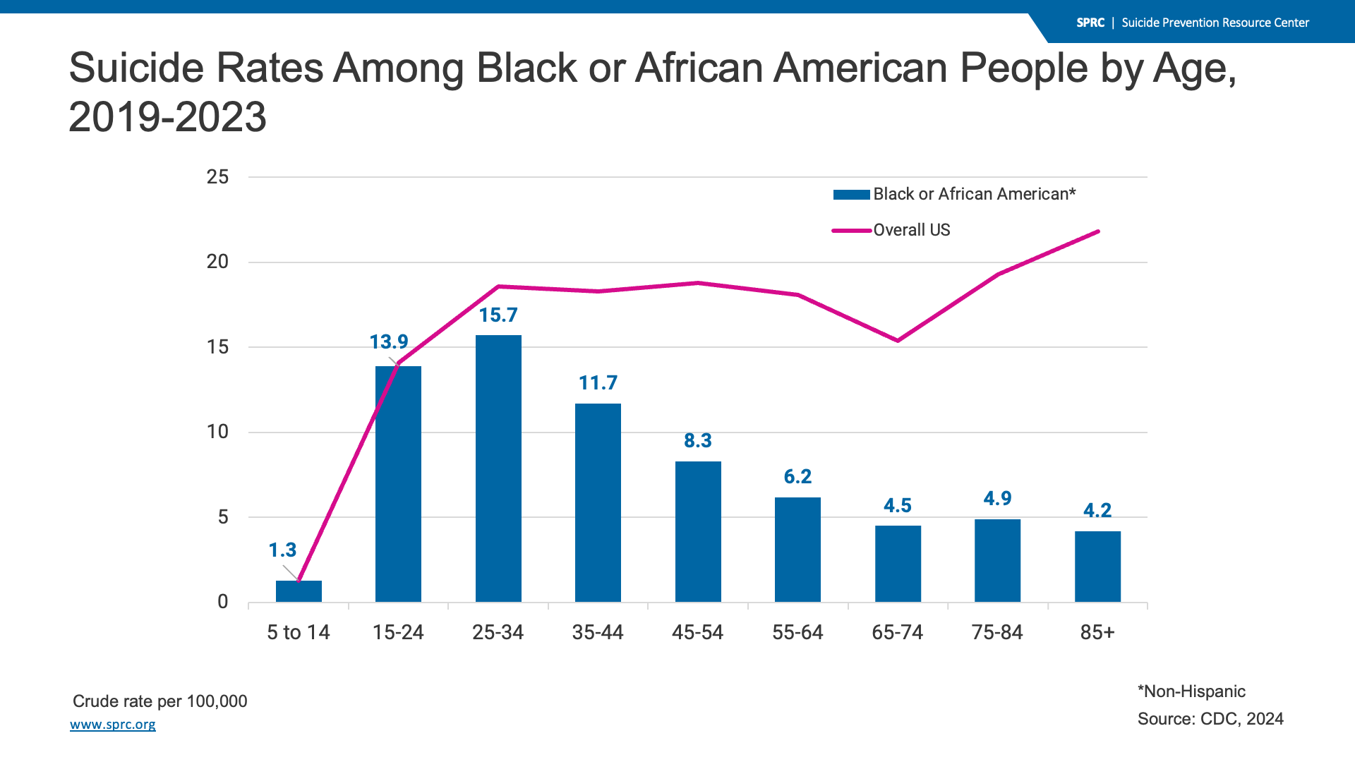 Black or African American people had significantly lower suicide rates than the overall U.S. population between 2019 and 2023. During this time period, the suicide rate among Black or African American people increased slightly, from 8 to 9 per 100,000, while the rate for the overall U.S. population stayed at 14 per 100,000.