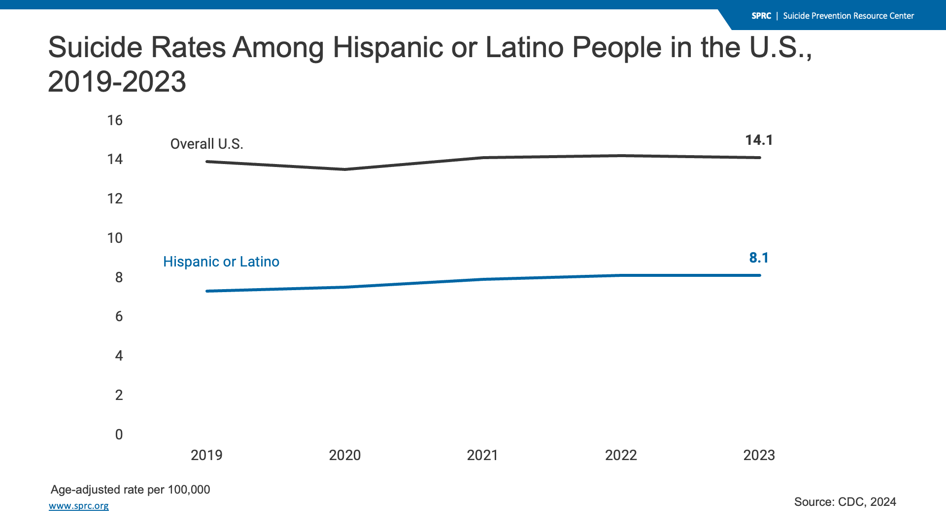 Hispanic and Latino people in the U.S. had significantly lower suicide rates than the overall U.S. population between 2019 and 2023. The suicide rate among Hispanic and Latino people in the U.S. increased slightly from 7 to 8 per 100,000 during this time period, while the rate in the overall U.S. population stayed at 14 per 100,000.