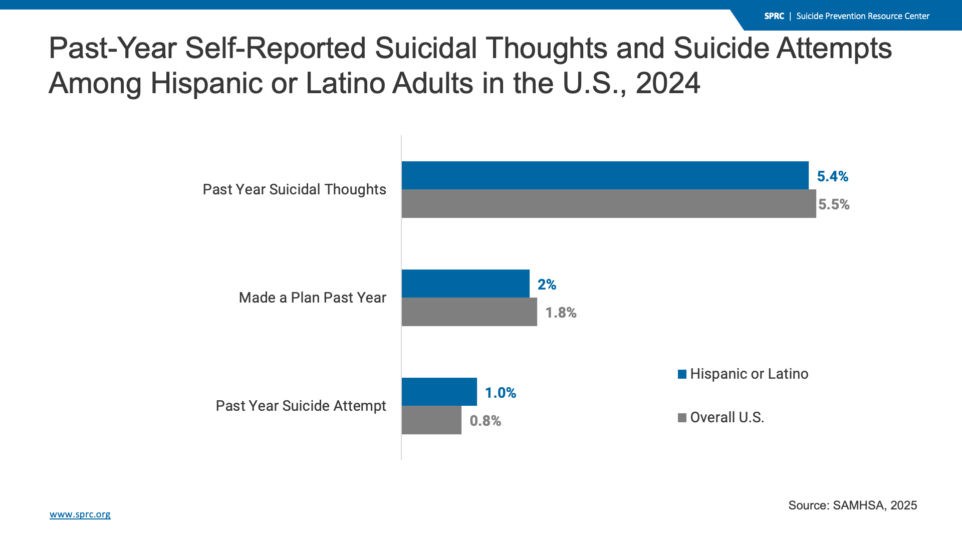 In 2024, Hispanic and Latino adults reported past year suicidal thoughts and suicide plans at approximately the same rate as the overall U.S. population.